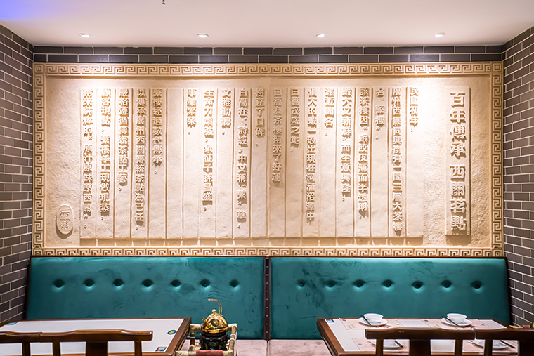 在我們另外一個全案策劃設計項目悅得閑廣式點心茶樓,則始終圍繞廣式早茶文化、得閑飲茶的老廣州休閑美食文化,用墻面雕塑造型,品牌故事上墻,得閑飲茶的霓虹燈裝置來表現。既讓整個用餐空間的廣式茶點休閑氛圍非常濃厚,嶺南文化的品位呈現也非常直觀。
