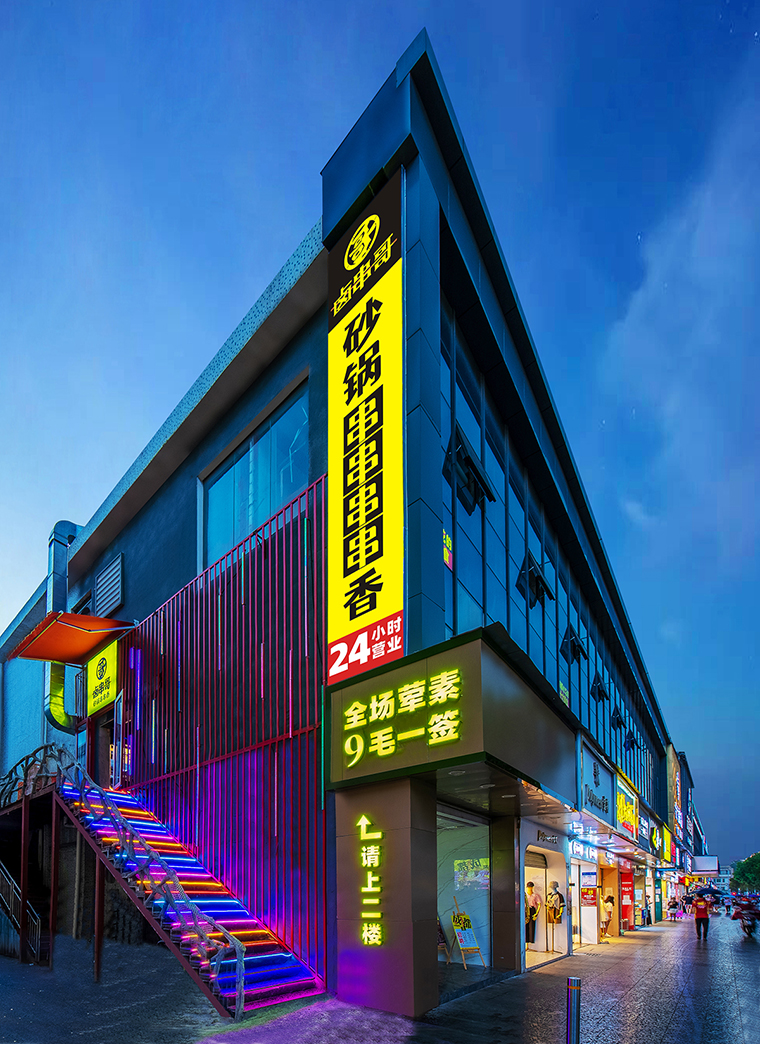 1、將門頭設計轉變成門面設計,重點投入,反復推敲,裝修經費傾斜,用力猛一些。鹵串哥坪山店的整個外立面廣告招牌,設計非常大氣,覆蓋一整面墻,讓遠遠的顧客都能看見,門面上顧客可看見的地方不斷重復強調品牌核心訴求,如24小時營業,地道成都砂鍋串串香,小姐姐必吃成都十大美食,9毛一簽等,讓門面成立吸引消費者進店的大利器。