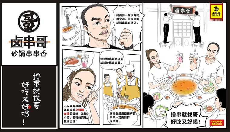 我們從鹵串哥品牌內在基因出發,提取升華了哥的文化,哥的符號。哥在四川既是表達親切信賴,尊重,也是袍哥文化,江湖義氣的表達;同時哥還是負責,擔當的意象;哥還與當下外賣小哥、快遞小哥、餐廳服務小哥的一種親切稱呼。