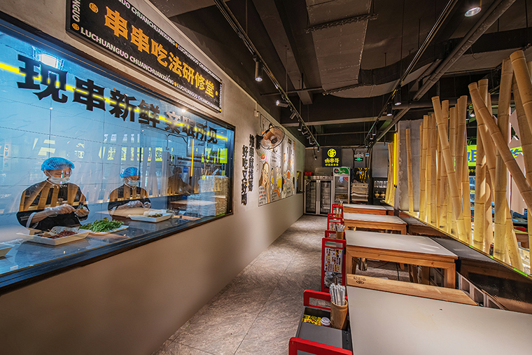 在空間中,我們用鹵串哥品牌強關聯的具體一個竹元素串聯整個裝飾,形成品牌專屬識別記憶,并與串串香的竹簽子,竹椅相呼應,既有品類特征,又是品牌文化的經典傳達。
