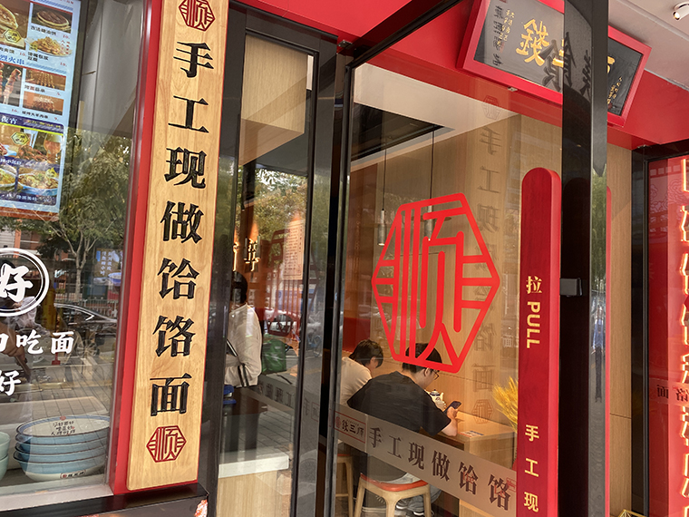 1、從門頭設計到門面設計表達,整個門店設計的重心:手工現(xiàn)做饸饹面,這是我們產品的靈魂,也是我們區(qū)別于其他連鎖面館產品的核心。康熙賜名,是品牌故事的傳說,也是饸饹面權威背書的一種方式。與門口張貼的非物質文化遺傳美食相呼應,讓消費者對饸饹面有了認知,對錢三順品牌肅然起敬;